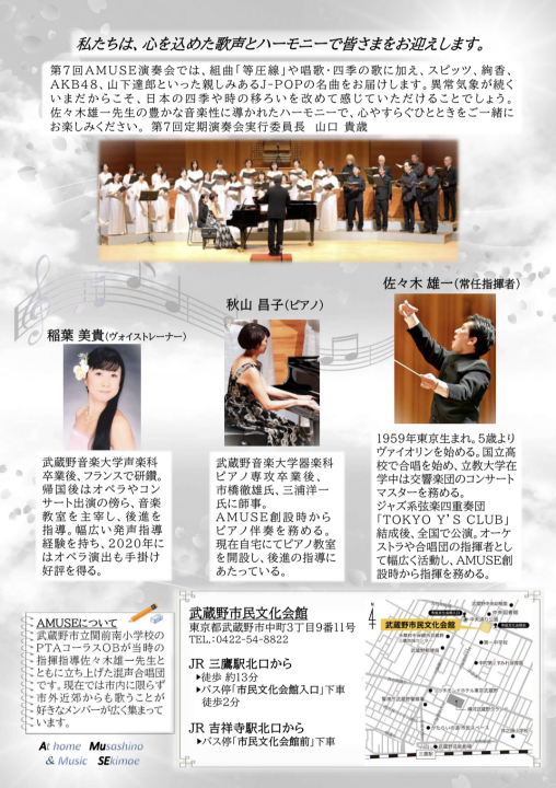 混声合唱団AMUSE(アミューゼ)は、武蔵野市で活動する合唱団です。